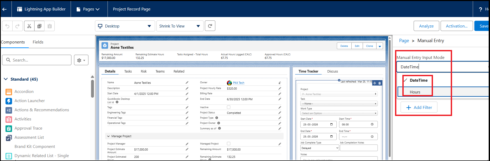 Limitations: Salesforce does not allow tracking time for Activities and Tasks. Therefore, the Manual Entry Lightning component cannot be added to Salesforce Activities or Tasks.