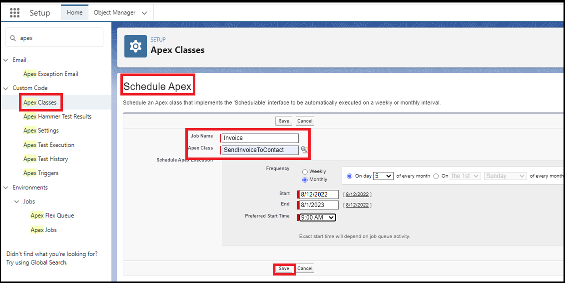 Enter the Job Name as Send Invoice and select SendInvoiceToContact in the Apex Class.