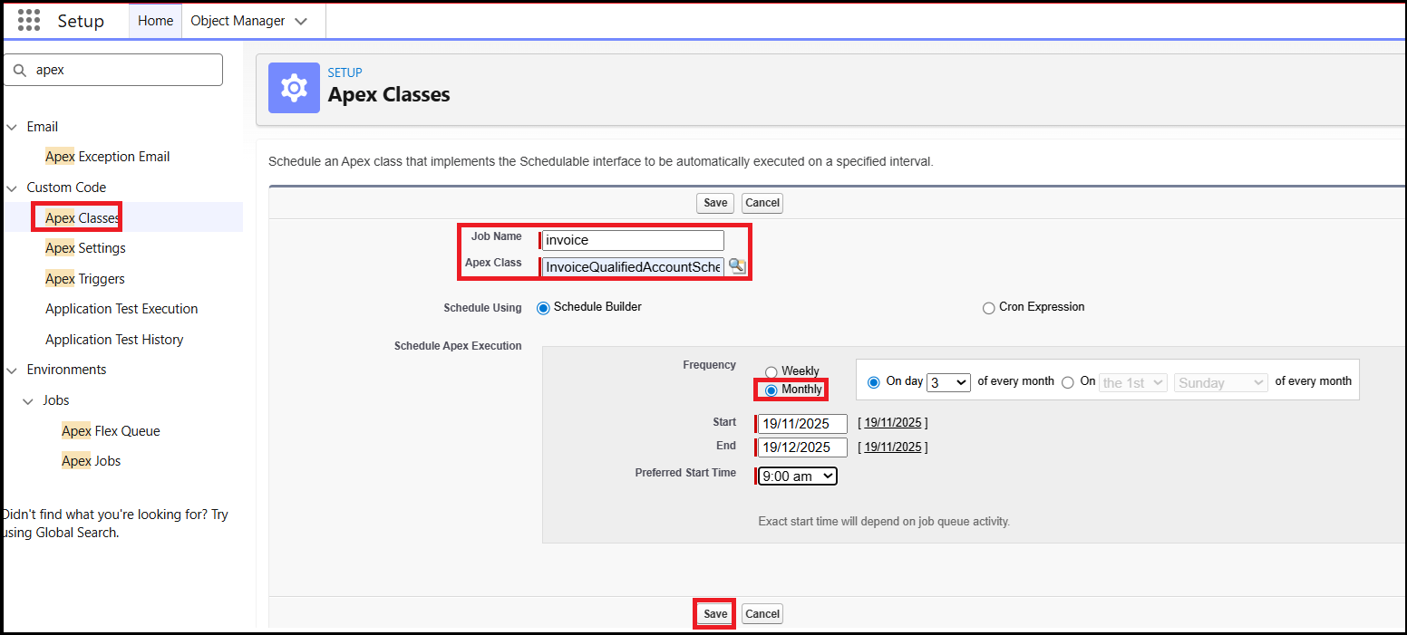 - Select "InvoiceQualifiedAccountScheduleClass" for Apex Class,