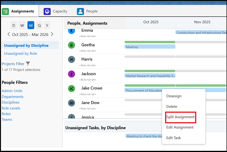 Hover over the task assignment name, right-click it, and select the Split Assignment option.