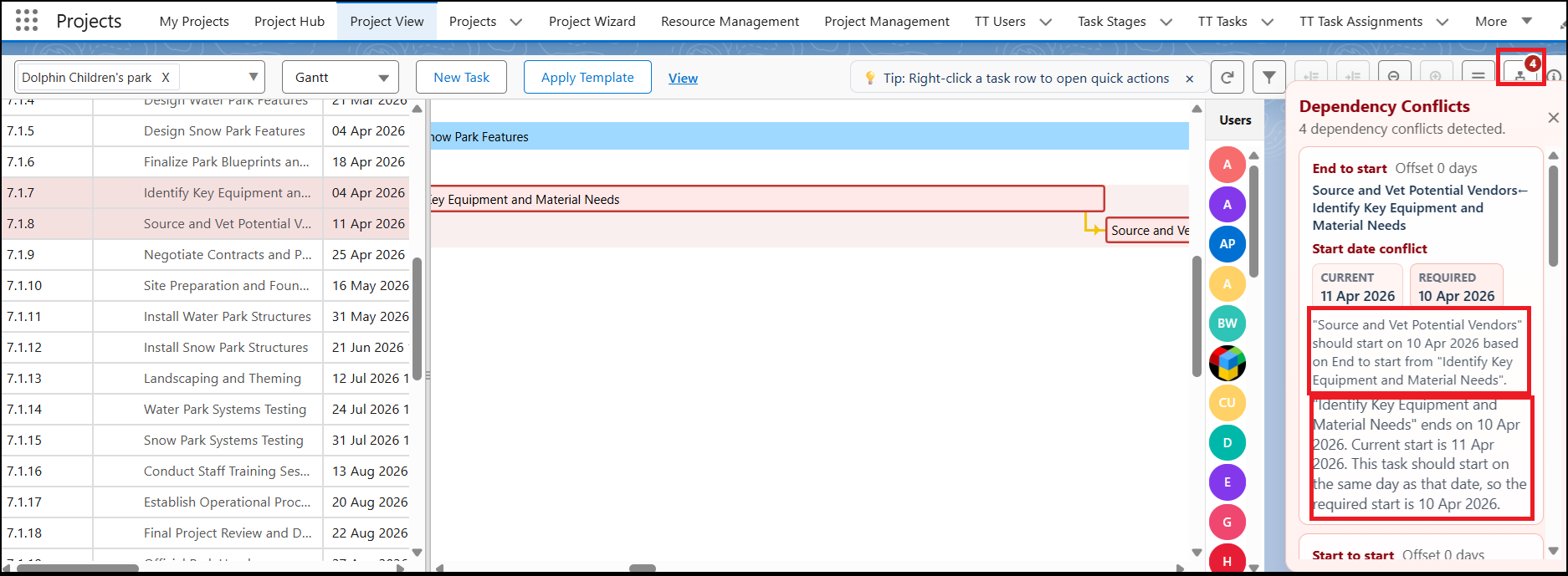 As a Manager, you create Projects, define Tasks, and set Task Dependencies. Whenever you make changes to a task’s Start Date or End Date, the system displays a Conflict Alert.